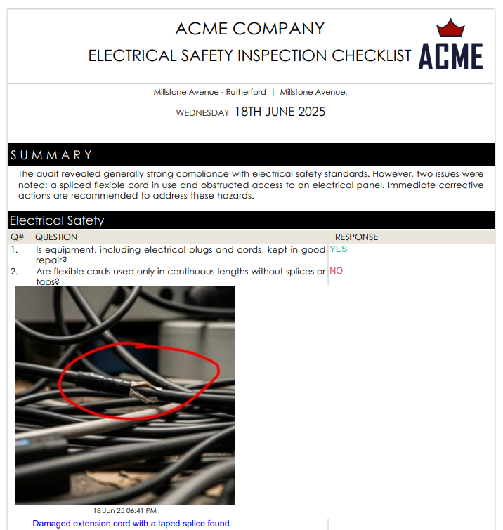 Once the electrical audit has been performed, it’s essential to document the findings clearly and systematically to ensure accountability and compliance with safety regulations and internal standards. The easiest and most efficient way to compile this information is by using an inspection software, which can automatically generate a well-structured, professionally formatted report. However, a standard workplace electrical inspection report can be prepared by following the steps below: